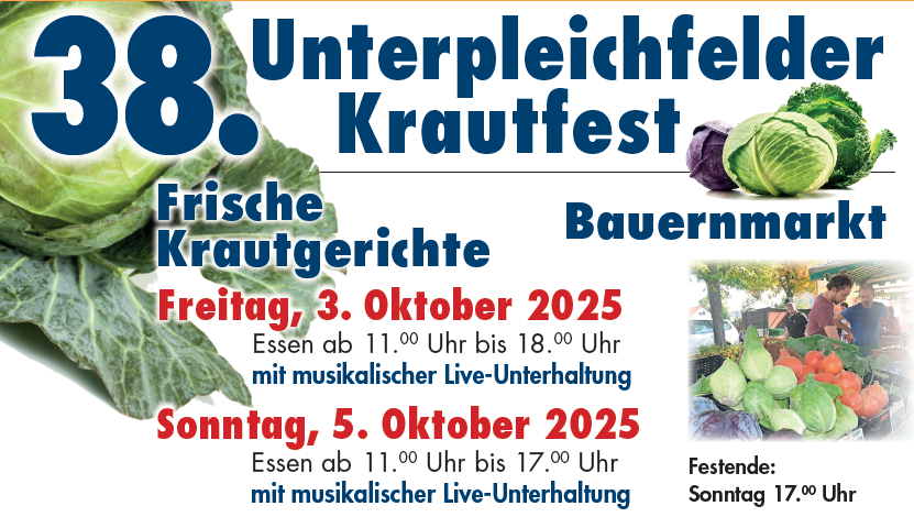 Bereits seit 1985 bietet die unterfränkische Krauthochburg Unterpleichfeld immer am ersten Wochenende im Oktober ein wahres Feuerwerk an Sauerkrautspezialitäten. So auch dieses Jahr am Freitag, 3. Oktober 2025, von 11.00 bis 18.00 Uhr und am Sonntag, 5. Oktober, von 11.00 bis 17.00 Uhr.